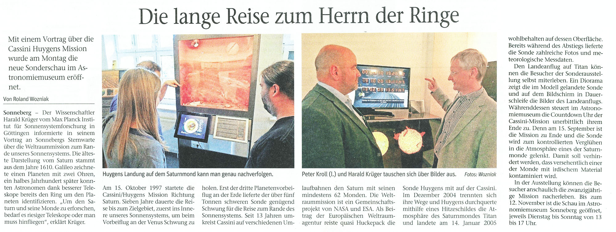 Das Astronomiemuseum der Sternwarte Sonneberg zeigt aus diesem Anlass in einer Sonderausstellung mit einer Fülle von großformatigen, spektakulären Bildern, welche Ergebnisse die Raumsonde bisher geliefert hat: die Entdeckung neuer Monde und Wellenmuster im Ringsystem des Riesenplaneten, mit Methan gefüllte Seen auf dem Mond Titan, Geysire und einen unter der Oberfläche verborgenen Ozean auf dem Mond Enceladus, der Raum für Spekulationen für die Entstehung von außerirdischem Leben eröffnet. Die von Mitgliedern des Astronomiemuseum e.V. gestaltete Sonderausstellung bietet eine moderne, audiovisuelle Entdeckungsreise durch das Saturnsystem bis hin zur Landung auf dem Titan.
