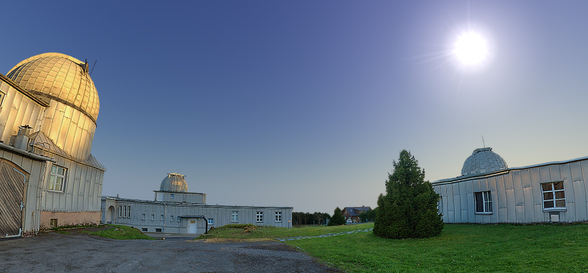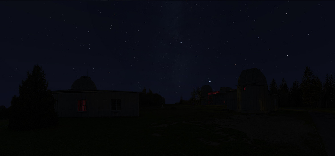 Der Standort für die Stellarium Landschaft liegt zwischen dem heutigen Haus 6 im Westen mit dem historischen Refraktor und Haus 5 im Osten. Nördlich befindet sich Haus 7, dahinter das neue Hauptgebäude. Im Süden ist das alte Hauptgebäude mit der Kuppel von 1925. Bei einbrechender Dunkelheit geht in einigen Fenstern Licht an, im neuen Hauptgebäude ist das Treppenhaus und der Gang auf dem Dach ebenfalls beleuchtet.