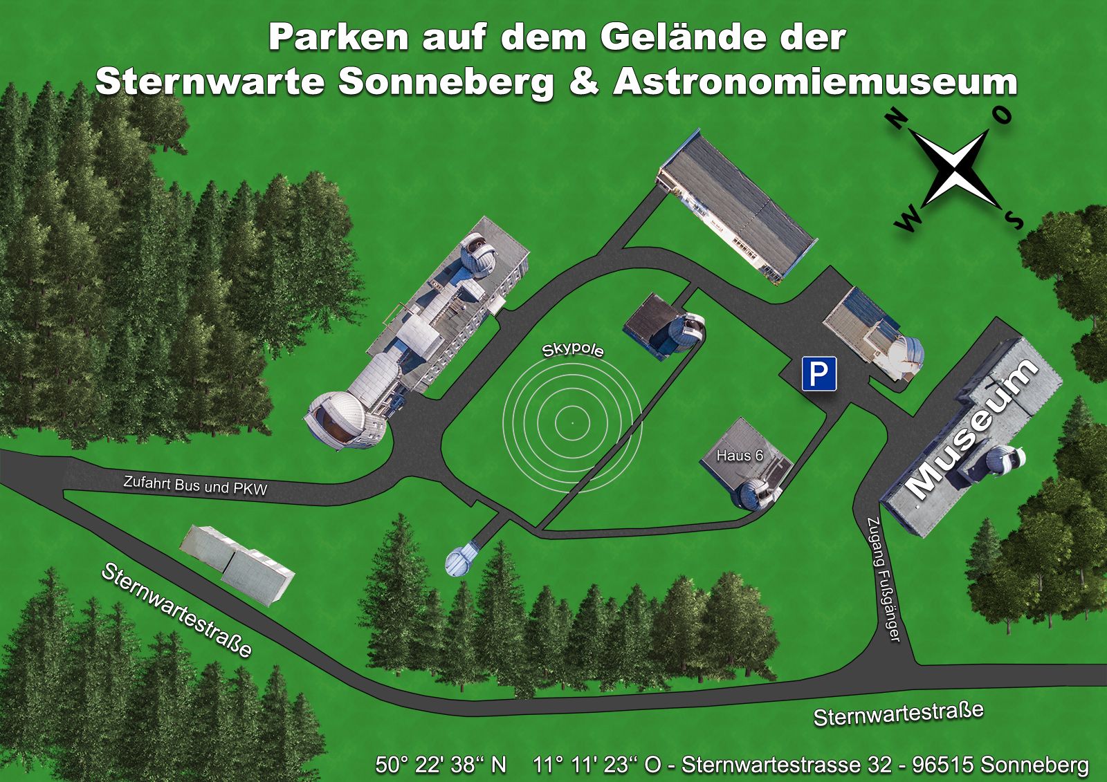 Parkplätze gibt es innerhalb des Geländes der Sternwarte, bitte fahren Sie dazu durch das große Tor. Am Zaun außerhalb des Geländes gibt es weitere Parkmöglichkeiten. Treffpunkt für Beobachtungsabende ist der Eingang des Astronomiemuseums.