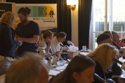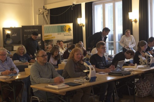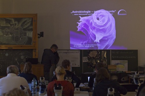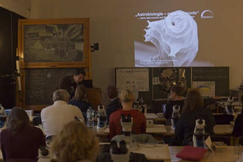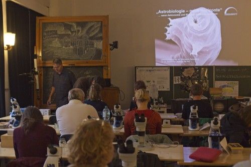 In drei Workshops wurden praxisnahe Ideen für den Unterricht erprobt. Besonders spannend war die Untersuchung von „Überlebenskünstlern“ wie Bärtierchen, die in der Umgebung der Sternwarte gesammelt und unter Schülermikroskopen betrachtet werden konnten. Ergänzt wurden die Aktivitäten durch Rechenaufgaben und ein Quiz rund um das Thema Astrobiologie.