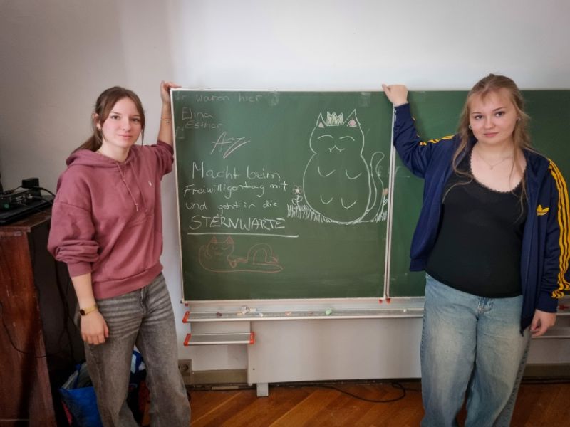 Am 5. Juni 2025 durften wir im Rahmen des Schülerfreiwilligentags zwei motivierte Schülerinnen bei uns im Astronomiemuseum der Sternwarte begrüßen. Mit großer Neugier und tatkräftiger Unterstützung haben sie mitgeholfen, den Messraum an der Museumskuppel neu zu gestalten. Nach einer gründlichen Aufräumaktion wurde ein alter Holztisch repariert – die perfekte Grundlage, um historische Messtechnik aus unserem Depot wieder ans Licht zu bringen. Dieser Bereich soll ab 2026 im rahmen von Führungen wieder Besuchern zugänglich werden.