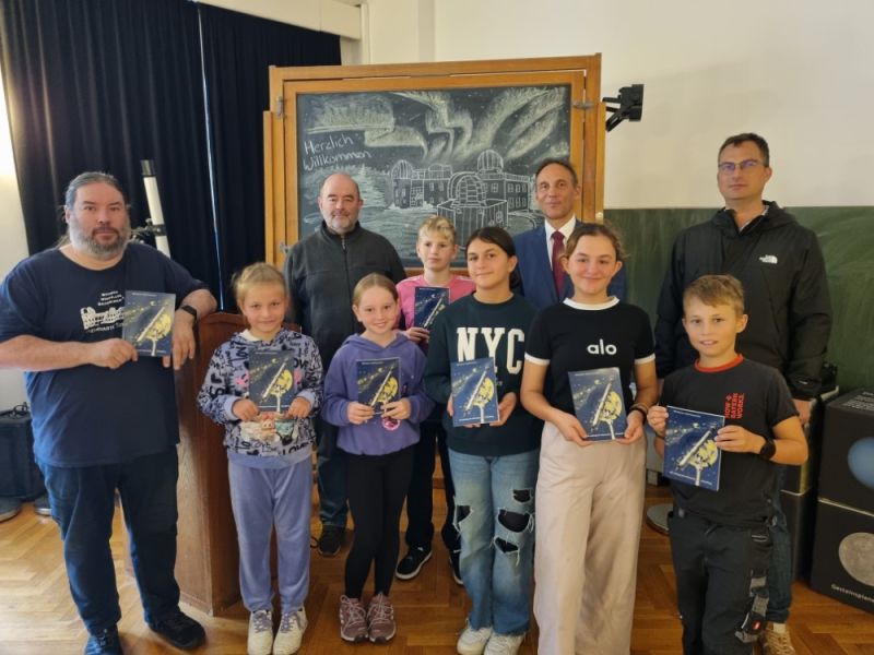 Am 25. September 2025 besuchte die 5. Klasse der Cuno-Hoffmeister-Regelschule das Astronomiemuseum der Sternwarte Sonneberg. Im Rahmen dieses Besuchs erhielten die Schülerinnen und Schüler ein besonderes Geschenk: Christian Dressel (Hauptamtlicher Beigeordneter), Museumsleiter Thomas Müller und Dr. Peter Kroll (Leiter der Sternwarte) überreichten ihnen das Buch „Die Anfänge der Sternwarte Sonneberg“ von Wilhelm Hoffmeister.