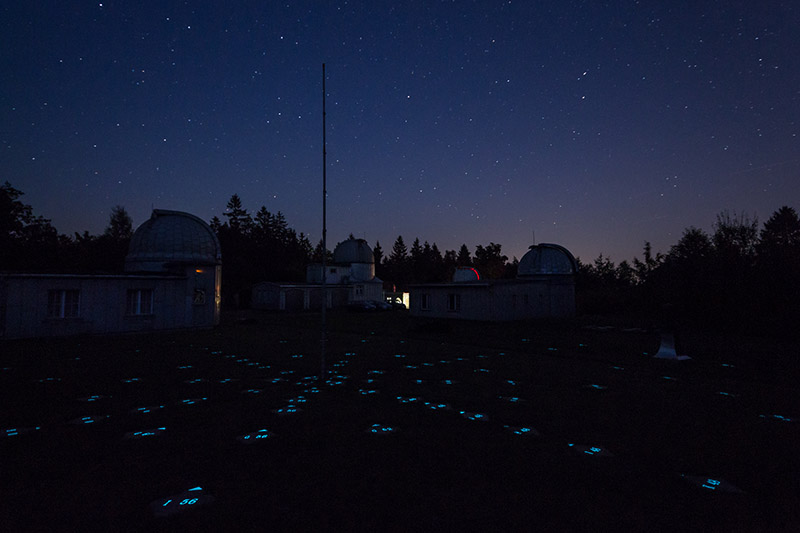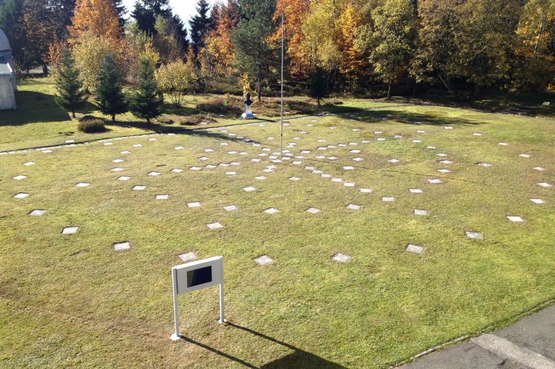 Eine Testinstallation von SkyPole® befindet sich auf der großen Wiese zwischen den Gebäuden der Sternwarte. Die Installation besteht aus einer etwa 8 m langen Stange (Pole) und einem um diese Stange befindlichen Koordinatensystem, gebildet aus auf der Wiese ausgelegten Steinplatten.