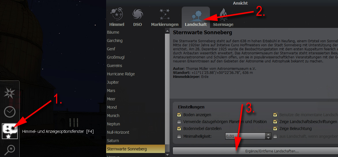 Nachdem Sie die .zip-Datei für die Landschaft von dieser Seite heruntergeladen haben, müssen Sie diese in Stellarium installieren. Wenn Sie Stellarium 0.10.6 oder eine neuere Version haben, können Sie die Landschaften automatisch zu installieren:
